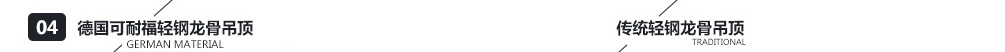 專用輕鋼龍骨,采用專用連接件,杜絕吊頂變形、開(kāi)裂、蟲(chóng)蛀等現(xiàn)象。